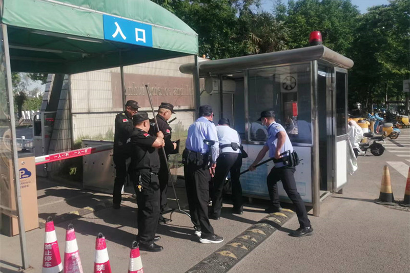 演练前,派出所民警向在场的安保人员详细讲解今天反恐场景(持刀砍人类)。一门暴徒首先持刀砍伤校门前一名路人,随即冲到校门口叫嚣着想要强闯校园,值班门卫见状立即向保卫处领导汇报情况,保卫处领导立即下令:“立即启动反恐应急预案”,随即拨打110报警。三名保安手持防暴器械冲出校门与暴徒周旋,一边力图制服暴徒,一边等待民警到来。很快派出所民警赶到将暴徒制服带走。整个演练过程,校警安保力量配合得力,场景真实、生动、逼真,气氛紧张,达到了演练预期效果。