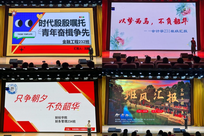 本次班级风采大赛分为PPT汇报和舞台展示两个环节。在PPT汇报中,各班围绕班级组织制度、班徽班训班规、班级文化建设、团学活动、学风建设措施等方面进行讲解,多角度全方面展现了班级取得的成绩和大学生昂扬向上、朝气蓬勃的青春风貌。