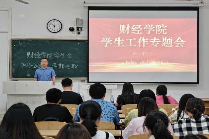 为贯彻落实习近平总书记关于青年工作的重要思想,巩固深化学生会改革和建设成果,提高学生会队伍的整体素质和综合实力,6月24日,财经学院在致知楼C108召开2023-2024第二学期学生会述职评议大会。学院党委副书记耿广汉、团委书记薛枫、专职辅导员尹成超、校学生会代表武华宇应邀担任述职评议评委。学院学生会全体成员参加。