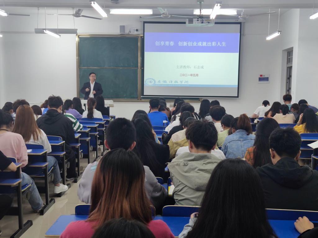 石志成老师讲座主题是《创享青春创新创业成就出彩人生》,讲座内容分三块:为什么要创新创业,创新创业要做什么,大学生该怎么做。从中国创业发展的四个阶段可以看出创新创业已成为中国经济新引擎。大学生创业教育的目的是从人的发展出发,培养大学生综合素质,不只是鼓励学生去创业。石志成精彩演讲让台下听众了解创业内涵,认清未来创业趋势,明确当下应提升自我并锻炼自己的思维模式。讲座现场,石老师多次举例说明,讲座形象生动,现场氛围热烈。