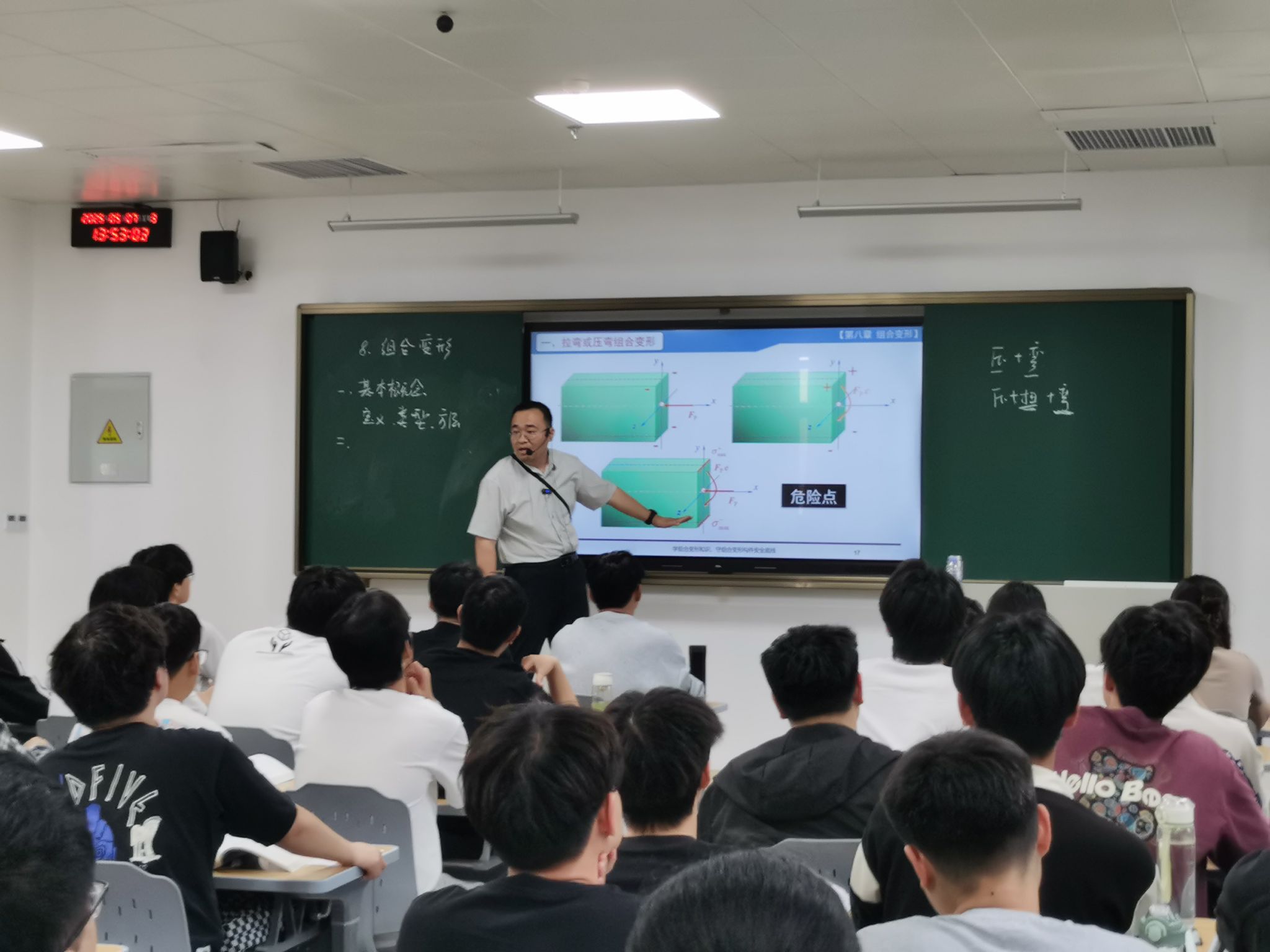 授课过程中,缑教授采用启发式、案例式教学方法,借助动画模拟和实物模型,直观展示了不同荷载条件下构件的变形规律。他注重引导学生从工程实际问题出发,运用理论分析解决复杂力学问题,充分体现了“以学生为中心”的教学理念。缑教授还将学科前沿进展和自身科研成果融入课堂,展现了深厚的学术功底和卓越的教学能力,为全校师生呈现了一堂高质量的示范课。