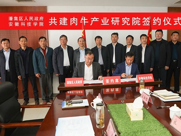 10月22日上午,我校与淮南市潘集区人民政府共建肉牛产业研究院签约仪式在校图书馆九楼会议室举行。校党委书记时伟,党委委员、副院长李升和,淮南市委常委、潘集区委书记宋立敏,区委副书记、区长闪健,区政协主席董善积,区委常委段传策,副区长宋永,党委(校长)办公室主任卢星辰、科研处处长陈丰、教务处副处长周金星、动物科学学院院长范红结,以及潘集区有关部门负责同志出席仪式。签约仪式由李升和主持。