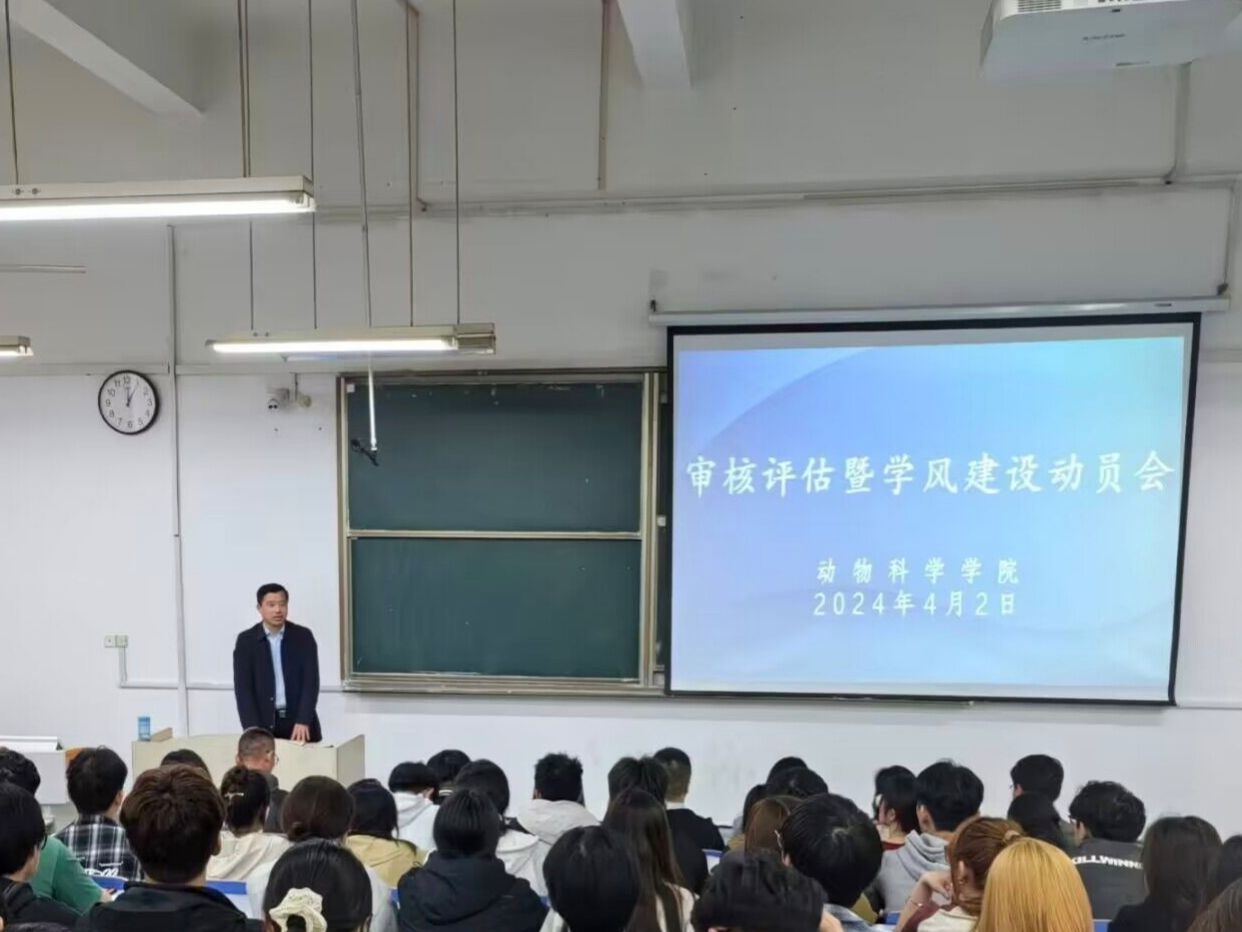 汤帅首先讲解了本科教育教学审核评估的目的、意义和要求,强调学校审核评估取得良好成绩对学生的积极影响,并向同学们宣读了动物科学学院2024年学风建设实施方案,要求同学们根据方案认真完成各项任务。他强调,各位学生干部要带领同学们认真学习本科教育教学审核评估应知应会,加强班级凝聚力和班风学风建设,努力打造安科名片,树立动科形象。
