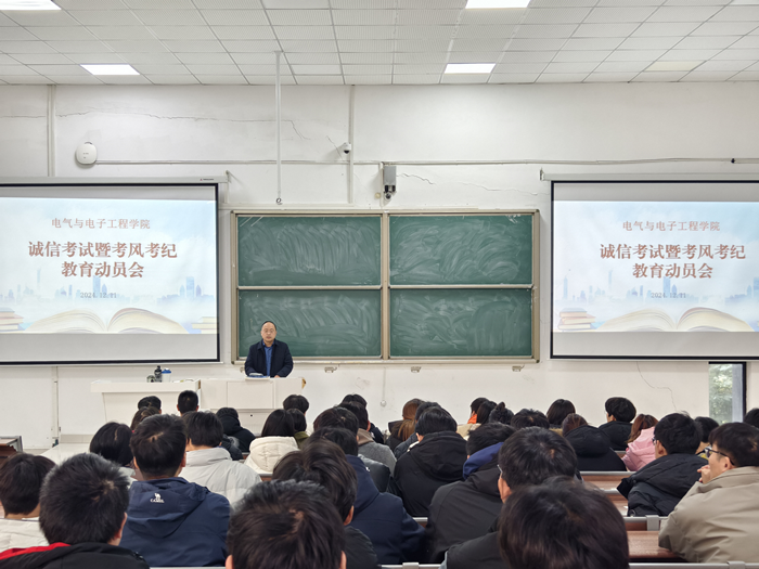 为倡导诚信考试,进一步规范考风考纪,12月11日下午,电气与电子工程学院于致知楼A111召开诚信考试暨考风考纪教育动员会。学院党委副书记、纪委书记尚磊,专职辅导员陈更强出席会议,各年级学生干部及学生会学习发展部全体成员参加会议,会议由学习发展部钟宇杰主持。