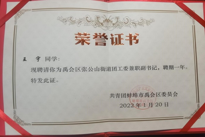 信中指出,王宇同学作为蚌埠籍大学生,能够主动请缨,积极响应号召,在家乡街道任职,在实践中锻炼自我,荣膺担当;思想开路,实干架桥,践行新时代大学生的理想与担当,能够在平日工作里以谦逊平和、踏实肯干的态度去了解群众,运用所学所思去帮助解决居民群众的实际问题,充分展现了必一体育平台_必一体育平台(中国)股份有限公司学子的奕奕风采。
