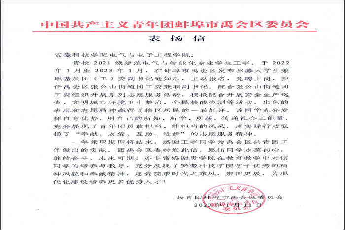 近日,一封由共青团蚌埠市禹会区委员会寄出的表扬信送达我校。信中对我校21级建筑电气与智能化212班学生王宇自2022年1月至2023年1月在共青团禹会区委兼职期间的工作表现提出的表扬。