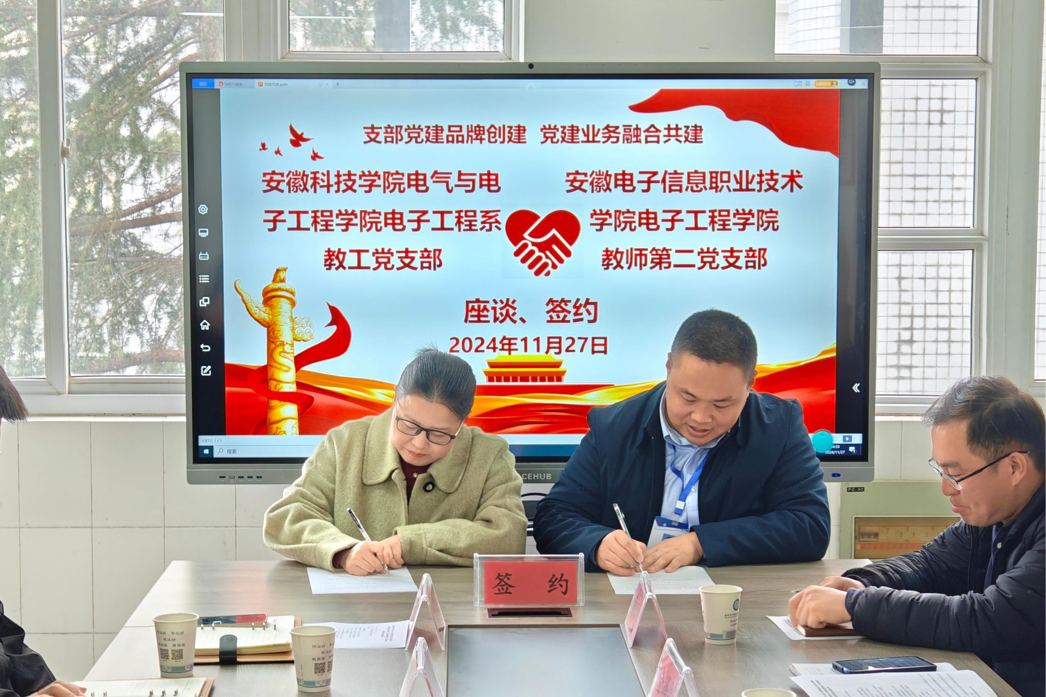 为拓宽高校基层党组织党建工作渠道,构建高校资源共享、相互促进、优势互补、共同提高的党建工作格局,2024年11月27日下午,必一体育平台_必一体育平台(中国)股份有限公司电气与电子工程学院副院长樊晓宇及电子工程系教工党支部6名党员教师赴安徽电子信息职业技术学院与电子工程学院教师第二党支部开展结对共建主题党日活动。安徽电子信息职业技术学院电子工程学院院长方庆山参加了结对共建签约仪式。