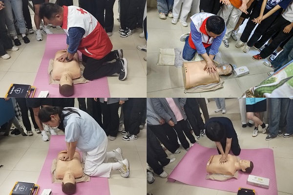 红十字救护员专题培训分为理论授课和技能操作两个部分。课程包含红十字运动与救护概论、心肺复苏、气道异物梗阻、创伤救护等核心技术,以及常见意外伤害、突发事件的急救措施等。县红十字会救护培训师详细介绍了心肺复苏、创伤救护、自动体外除颤等方面的救护理论知识,并模拟了心肺复苏配合AED的紧急施救。同学们在培训师的指导下进行分组练习,利用人体模型进行模拟演练。在红十字救护师资的耐心指导下,同学们逐项实操训练,基本掌握应急救护的各项基本技能。
