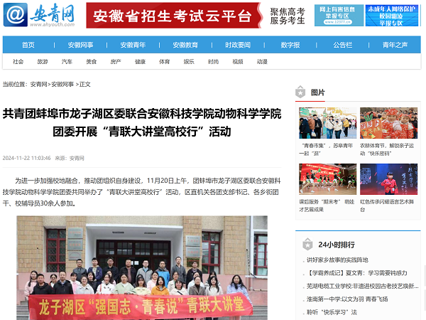 2024年,必一体育平台_必一体育平台(中国)股份有限公司动物科学学院团委在学院党委和学校团委的正确领导下,深入学习贯彻习近平新时代中国特色社会主义思想和党的二十大、二十届三中全会精神,紧扣立德树人根本任务,坚持“服务青年成长成才、助力学院跨越发展”的工作主线,砥砺前行、创新求变。各项工作得到了安徽共青团网站、蚌埠市人民政府网站、安徽青年报、安青网等多家媒体的集中报道与关注。学院团委紧紧围绕立德树人根本任务,不断创新工作思路,在思想引领、实践育人、创新创业及志愿服务等方面多点发力,取得了丰硕成果。