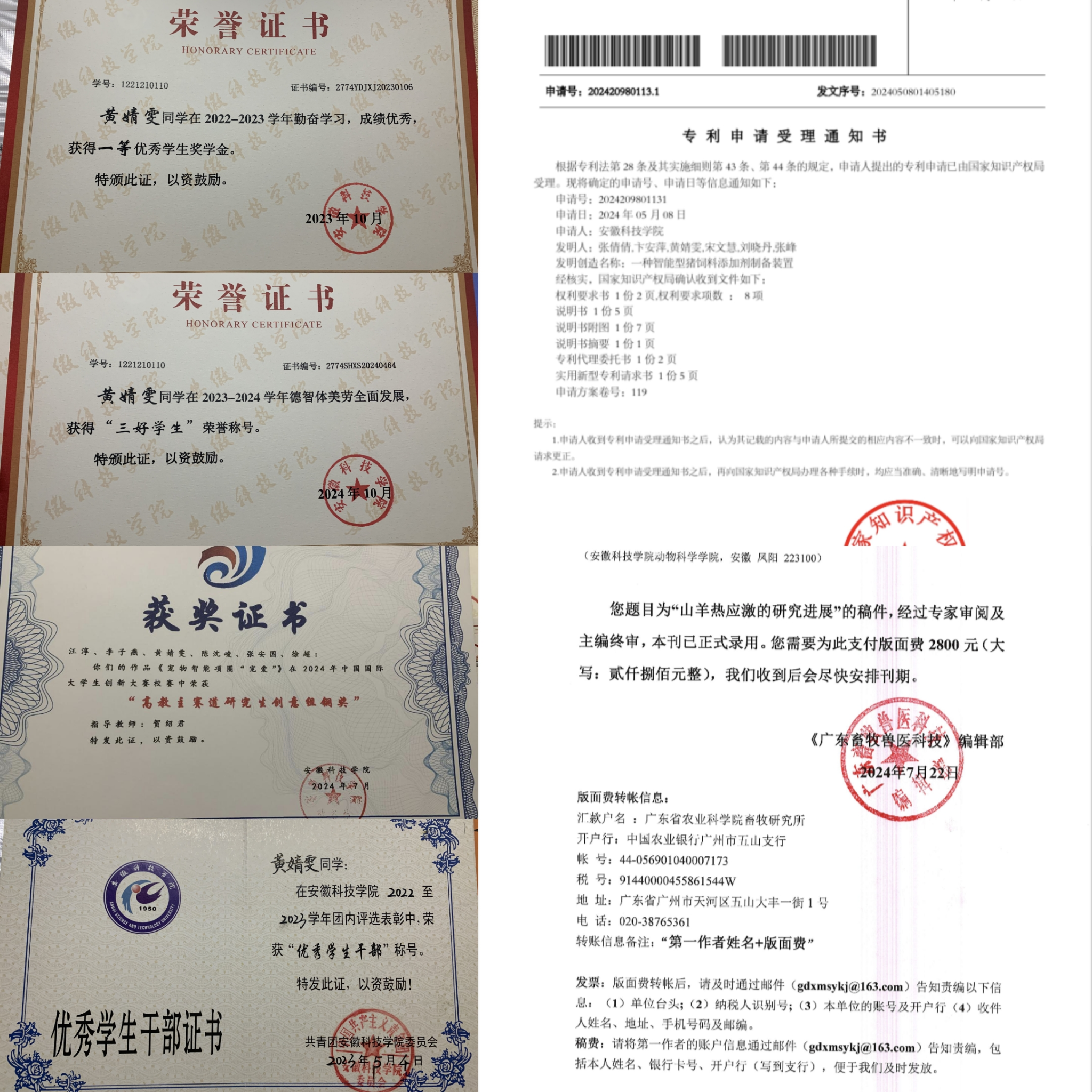 黄婧雯,共青团员,动物科学专业2021级学生,曾获学业一等奖学金、校三好学生、优秀学生干部、全国大学生英语竞赛二等奖(2次)、全国大学生英语竞赛三等奖、中国国际大学生创新大赛校赛“高教主赛道研究生创意组铜奖”、英语学习协会英语演讲比赛三等奖、第三十二届田径运动会优秀裁判员等奖项。发表学术论文一篇,拥有实用新型专利一项。