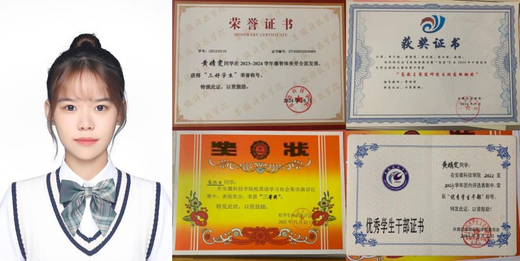 黄婧雯,2021级动物科学专业本科生,共青团员。现任班级文艺委员,曾任校大学生舞蹈协会副会长、院团委艺体中心负责人。曾获国家奖学金、学业一等奖学金、三好学生、优秀学生干部等荣誉称号,曾在全国大学生英语竞赛中获二等奖2次、三等奖1次,曾获得中国国际大学生创新大赛校赛“高教主赛道研究生创意组”铜奖。发表学术论文一篇,拥有实用新型专利一项。