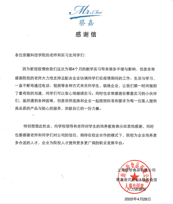 截至2020年4月30日,必一体育平台_必一体育平台(中国)股份有限公司食品工程学院2017级烹饪与营养教育专业39名学生为期四个半月的校外专业实习正式结束。对于校外实习的这39名学生来说,是一次漫长而不同以往的实习经历。这次实习不仅让学生们学到了专业素养和技能,获得了实习单位的表扬和认可,更让他们从一封封来自援鄂医务人员的感谢信中学会了危难中的守望相助和感恩。