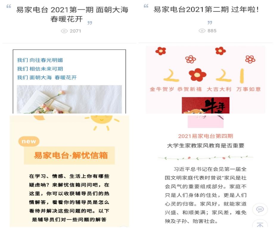 截至目前,2021年易家电台已开办四期,组织我校辅导员积极开展内容创作,围绕个人经历、年的味道、学生的近期困惑以及家教家风教育等方面进行内容创作,第一期辅导员用歌声吸引学生引起共鸣,第二期结合新年特殊节日与同学们分享年的味道,第三期采用线上解忧信箱形式搜集同学关心的问题,共收到学生来信100余封,第四期采用视频采访形式引导师生主动关注家风教育,网页及应用端四期浏览量已达7354次,师生评论688条。