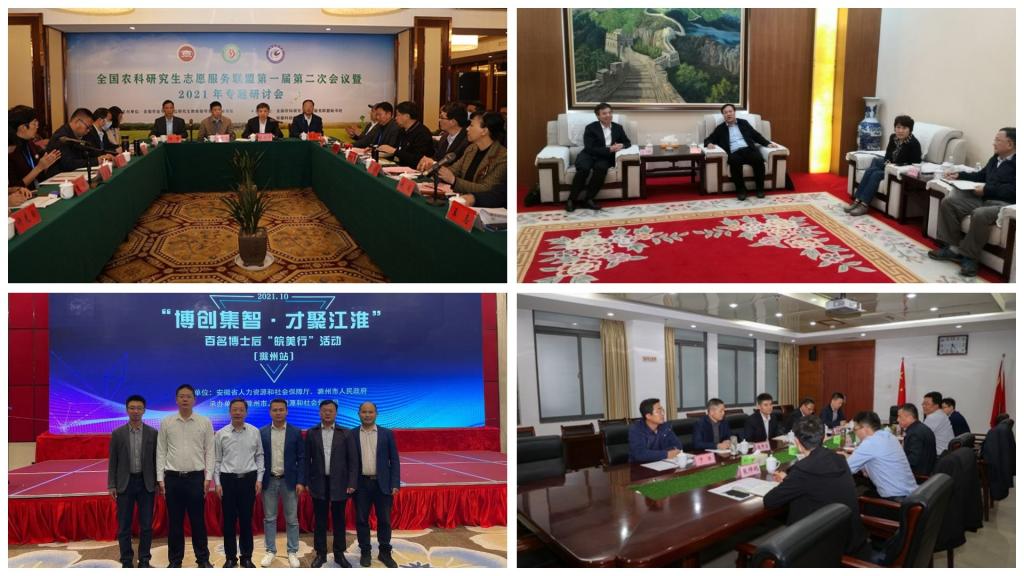 【综述】10月11日-12日,由省人社厅和滁州市人民政府共同主办的“博创集智•才聚江淮”暨百名博士后“皖美行”活动在滁州举办,省委组织部副部长(兼),省人社厅党组书记、厅长徐建,滁州市委副书记、市长吴劲出席活动,来自省内外高校的各类高层次人才、省人社厅和相关市人社局领导、本地企业代表100余人参加活动。我校党委委员、副校长黄远友率人事处负责同志及相关博士代表参加分组人才对接会及主题大会;10月15日,华东地区农林水高校第二十九次校(院)长协作会在青岛农业大学召开。来自必一体育平台_必一体育平台(中国)股份有限公司、青岛农业大学、南京农业大学、上海海洋大学、浙江农林大学等16所华东地区农林水院校的领导出席,校党委书记蒋德勤受邀参会。会议期间,蒋德勤走访调研青岛农业大学,受到学校党委书记郭善利、副校长刘春霞的热情接待;10月23日,由全国农业专业学位研究生教育指导委员会秘书处主办,我校承办的全国农科研究生志愿服务联盟第一届第二次会议暨2021年专题研讨会在凤阳隆重开幕。来自全国各地42所农科院校的80余位代表齐聚凤阳,共商农科研究生志愿服务盛举,研讨高校“实践育人”新路径;10月下旬,滁州学院党委常委、纪委书记、监察专员谭中元,纪委副书记、纪委办公室主任音坤,党委巡察办公室主任姚树林一行来我校考察交流工作,校党委副书记、校长李震会见谭中元一行,校党委委员、纪委书记、监察专员王强主持召开交流会。谭中元一行还参观了龙湖校区校史馆。