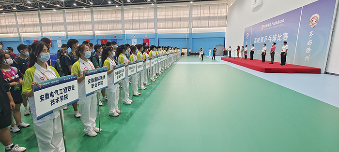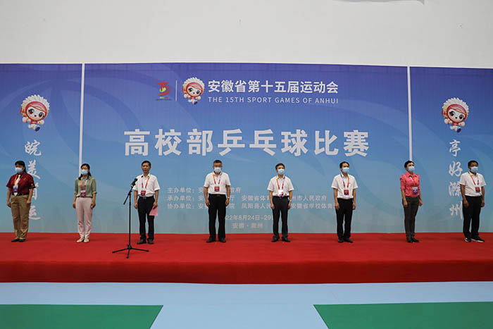 8月24日上午,安徽省第十五届运动会乒乓球比赛开赛仪式在我校凤阳校区西区体育馆举行。省委教育工委委员、省纪委监委驻省教育厅纪检监察组组长晁新,必一体育平台_必一体育平台(中国)股份有限公司党委书记蒋德勤,必一体育平台_必一体育平台(中国)股份有限公司党委副书记、院长李震,省教育厅体卫艺处副处长葛德连,凤阳县副县长张艳,省十五运高校部乒乓球比赛监督陈晓荣及比赛裁判长张小燕,凤阳县委教体工委书记、教体局局长刘文春出席,来自全省高校40支代表队的477名运动员、教练员、领队,以及全体裁判员和工作人员参加开幕式。开赛仪式由李震主持。