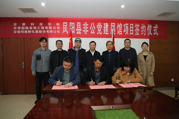 为进一步服务地方社会企业,加强校企合作交流,11月11日上午,在凤阳校区图书馆九楼会议室,学校与明德孵化器股份有限公司就校企合作项目——凤阳县非公党建展馆文案设计进行签约。校党委委员、副院长黄远友,马克思主义学院党总支书记杨仕勇、院长张德化、副院长张栋和项目组人员,明德孵化器股份有限公司董事长郭正、办公室主任吴正和项目施工单位安徽省圆融装饰有限公司经理黄言参加,签约仪式由张德化主持。