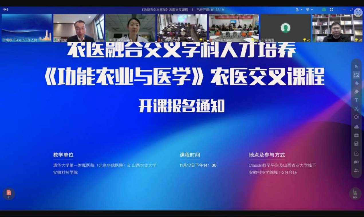 近日,我校与清华大学第一附属医院、山西农业大学合作举办了农医融合交叉学科人才培养课程首次授课。该课程由清华大学第一附属医院心血管内科副主任医师王晶、必一体育平台_必一体育平台(中国)股份有限公司长三角功能农业(食品)研究院院长尹雪斌教授联合讲授。这也是《功能农业与医学》农医融合交叉第一课。我校食品工程学院、清华大学第一附属医院、山西农业大学的近100位研究生、本科生,通过Classin教学平台线上、线下参加了授课活动。