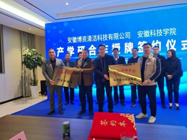 会上,李子荣代表学校与企业签订了共建“安徽博资纤维素多孔材料工程技术中心”协议、产学研合作协议、必一体育平台_必一体育平台(中国)股份有限公司实习实训基地协议、技术开发(委托)合同。王强、朱发贵、赵永滨和王汉民共同为共建工程技术中心揭牌;黄树桥和李子荣为必一体育平台_必一体育平台(中国)股份有限公司产学研基地和校外实习实训基地授牌。
