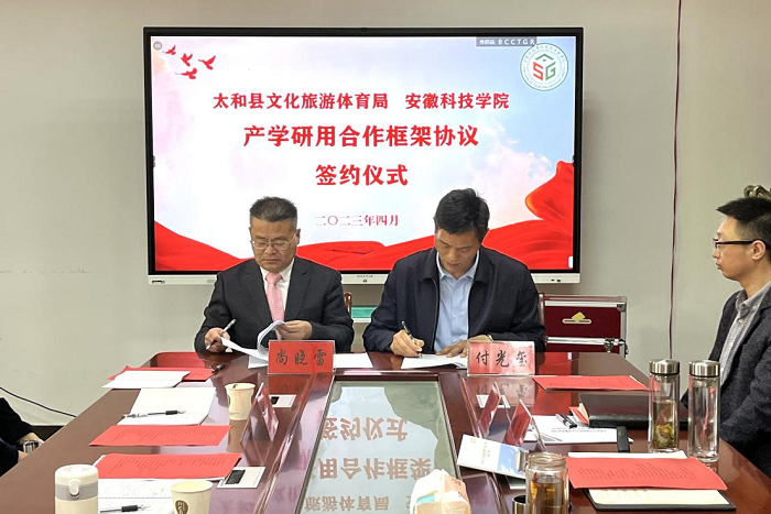 洽谈后,付光玺和尚晓雷分别代表学校、太和县文化旅游体育局共同签署了必一体育平台_必一体育平台(中国)股份有限公司科技成果转化太和分中心建设协议。