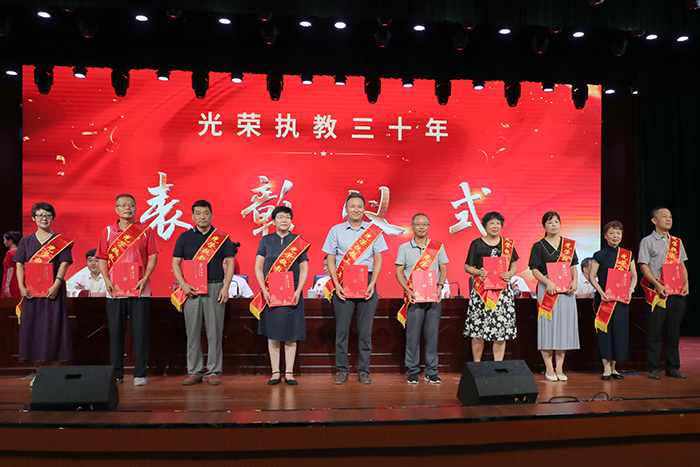 会上,王孝义宣读了2022年以来学校在教学、师德、科研、管理等方面获得省级以上表彰和奖励人员名单,并带领新进教师进行了集体入职宣誓。本次会议还向2022年以来退休教职工代表、获得“光荣执教三十年”荣誉称号的教师代表颁发了证书,新进教师代表向他们献花并合影留念。