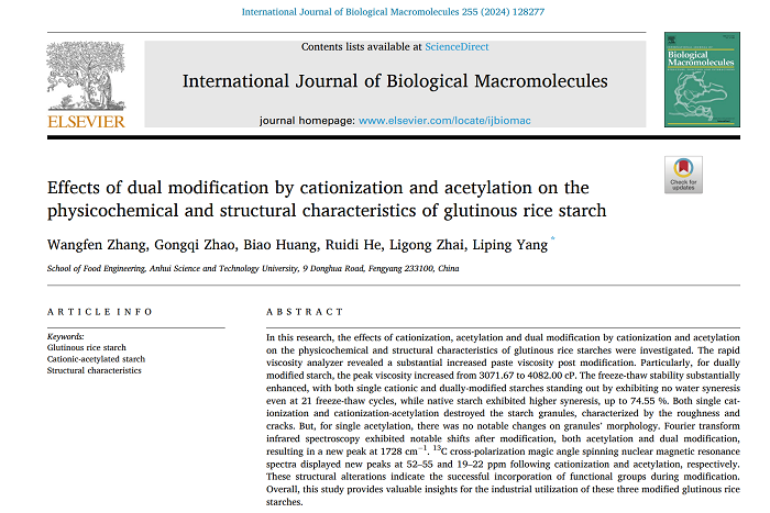 近日,我校2021级食品加工与安全领域研究生张王芬在生化与分子生物学领域Top一区期刊International Journal of Biological Macromolecules(IF=8.2)在线发表题为“Effects of Dual Modification by Cationization and Acetylation on the Physicochemical and Structural Characteristics of Glutinous Rice Starch”的研究论文。食品工程学院粮油及其副产物精深加工团队与营养科技创新团队负责人杨丽萍副教授为通讯作者,必一体育平台_必一体育平台(中国)股份有限公司为唯一完成单位。