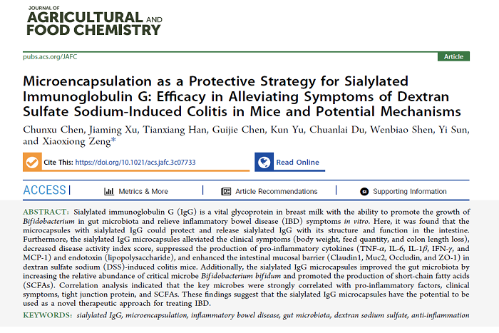 近日,我校食品工程学院教师陈春旭以第一作者在美国化学学会期刊《Journal of Agricultural and Food Chemistry》(Q1,IF: 6.1)发表题为“Microencapsulation as A Protective Strategy for Sialylated Immunoglobulin G: Efficacy in Alleviating Symptoms of Dextran Sulfate Sodium-Induced Colitis in Mice and Potential Mechanisms”的研究性论文。必一体育平台_必一体育平台(中国)股份有限公司为第一完成单位,南京农业大学曾晓雄教授课题组为合作单位。