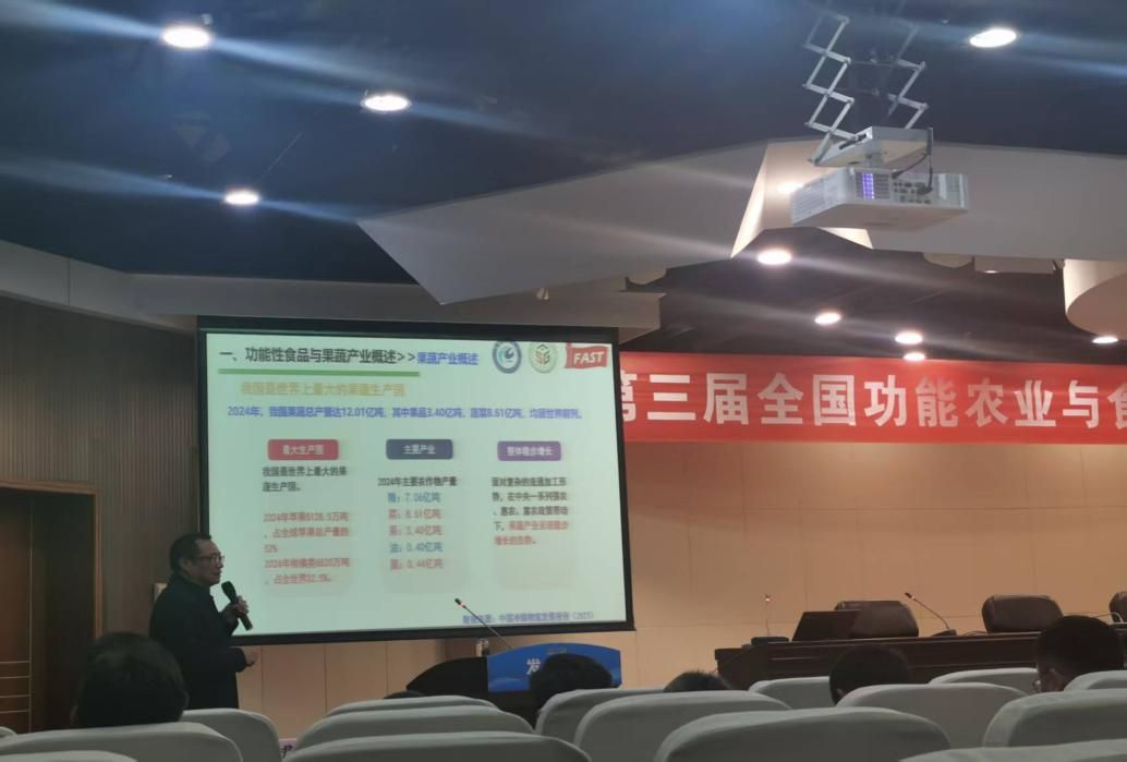 大会设置致辞报告、签约合作、颁奖表彰、成果发布等多个环节,汇聚政企学研力量,推动行业资源整合与技术落地。科技报告环节,我校长三角功能农业(食品)研究院院长尹雪斌教授以《发展功能农业与食品 培育未来新质生产力》为题线上作主旨报告,来自北京工商大学的俄罗斯工程院院士刘新旗教授、我校食品科学与工程学院院长杜传来教授、山东农业大学的田纪春教授、西安交通大学地方病研究所的熊咏民教授等专家学者分别作现场报告,与当地政府主管部门领导及企业们一起共同分享未来农业与食品发展前沿见解,为产业创新发展提供了丰富的智力支持。在成果推介环节,除了重磅的产业发展报告,长三角功能农业(食品)研究院陈友桃博士还专题推介了我校在功能农产品研发与产业化方面的最新成果。
