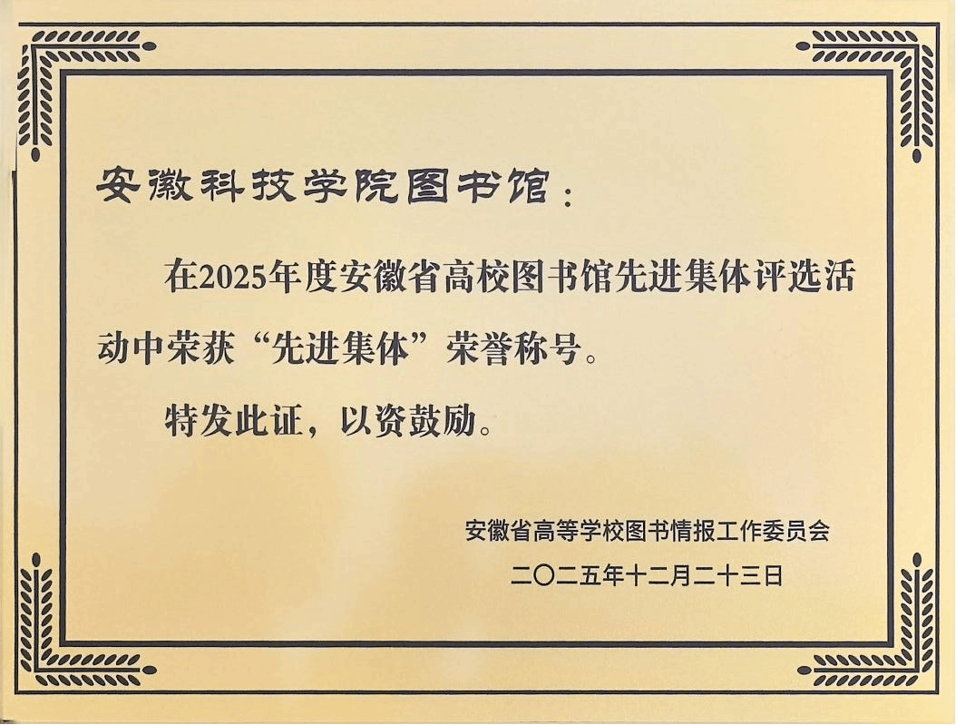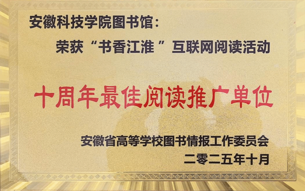 1月8日至9日,由安徽省高等学校图书情报工作委员会主办的2025年安徽省高校图书馆馆长年会在宿州市召开。会上,对2025年度安徽省高校图书馆先进集体和先进个人进行表彰,我校图书馆凭借在智慧化图书馆、文化赋能、社会服务、资源建设等方面的扎实成效,获评安徽省高校图书馆“先进集体”,馆员刘淑婧荣获“先进工作者”称号。此外,我馆在“书香江淮”互联网阅读活动中表现优异,获评“十周年最佳阅读推广单位”。