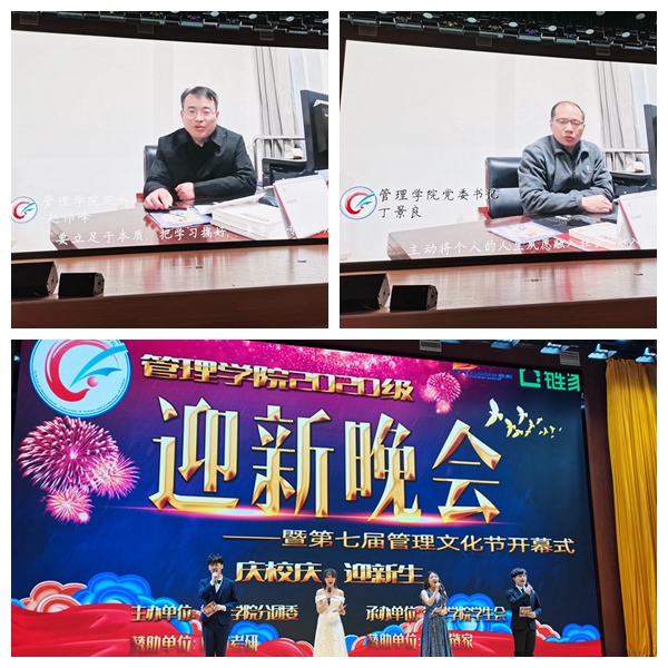 庆校庆逐梦辉煌,迎新生青春绽放,12月6日晚,管理学院在龙湖校区东辅楼报告厅隆重举办2020级迎新晚会暨第七届管理文化节开幕式。院党委书记丁景良,院党委副书记、院长赵伟峰出席了本次晚会,全体辅导员和全体2020级新生参加观看了本次晚会。晚会由王雪怡、汪鑫、黄赟华、黄晓璇主持。