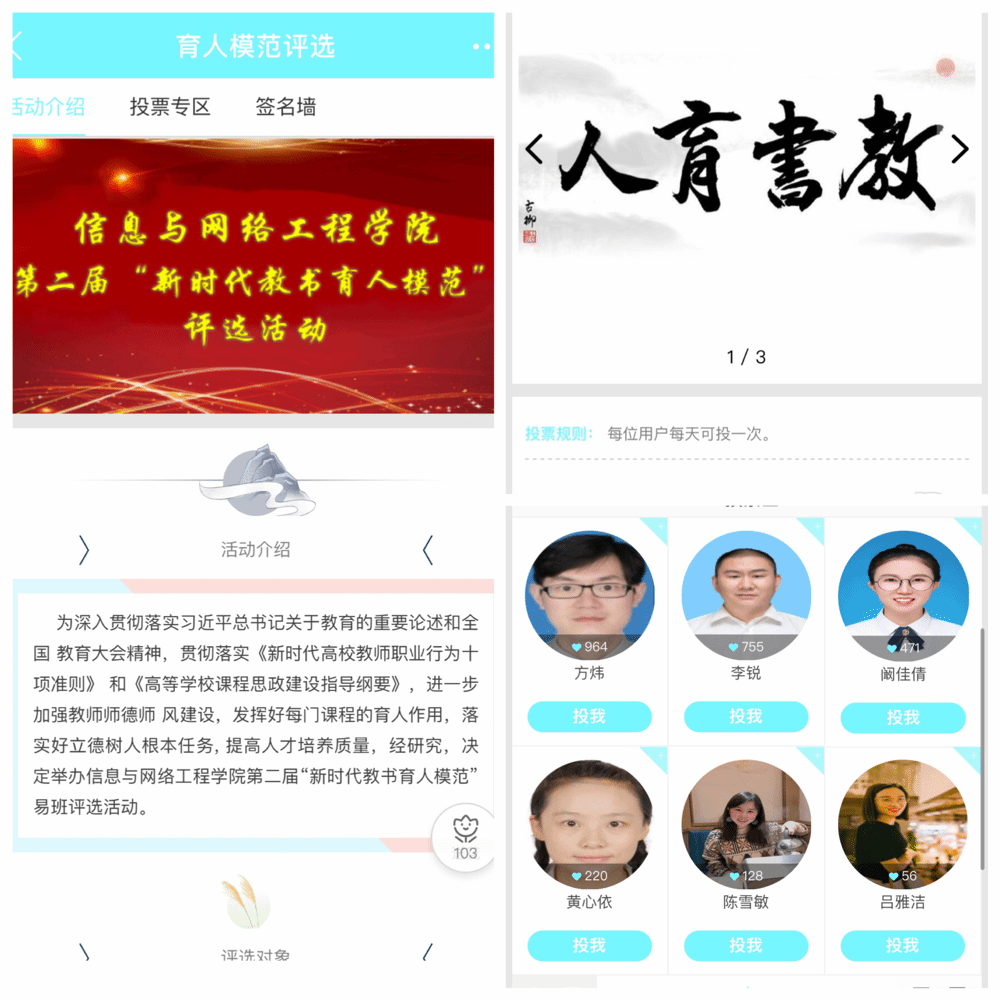 本次评选活动,采取线上线下相结合的方式,线上通过易班平台以《新时代高校教师职业行为十项准则》为评选标准搭建投票轻应用,学生们坚持公平公正的原则,郑重地为学院教师投上宝贵的一票,为期六天累计2658人次参与投票。线下从参评教师指导学科竞赛、大学生创新创业训练计划项目、“互联网+”创新创业大赛、毕业实习、毕业论文等情况进行综合赋分考量,全方位展现学院教师积极向上、奋勇争先的精神风貌。