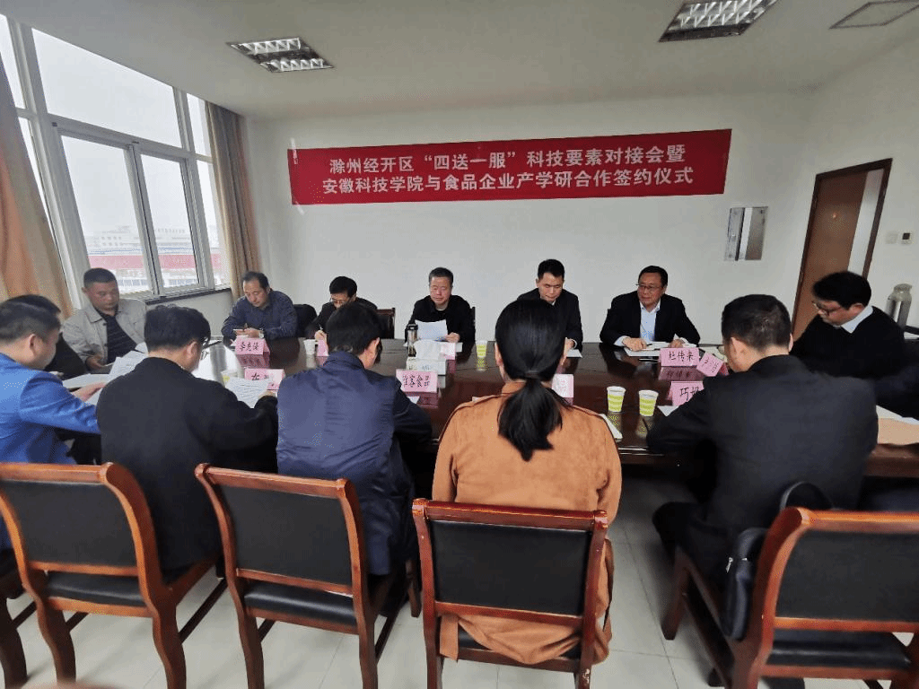 4月22日下午,在滁州经开区管委会四楼会议室举行滁州经开区“四送一服”科技要素对接会暨必一体育平台_必一体育平台(中国)股份有限公司与滁州经开区食品企业产学研合作签约仪式。我校食品工程学院院长杜传来、服务地方发展研究院院长詹秋文、特色农产品加工研究所所长李先保及彭钢、马菲菲两位专任教师参加此次对接会及签约仪式。滁州市经信局副局长张正强、滁州市科技局总工程师卢少悟、滁州经开区管委会副主任潘金钟、滁州经开区企业服务中心主任刘钊以及安徽盼盼食品有限公司、安徽银鹭食品有限公司、安徽东鹏饮料有限公司、安徽巧妈妈食品科技有限公司、雅客食品(滁州)有限公司的代表等出席签约仪式,仪式由滁州经开区管委会副主任潘金钟主持。
