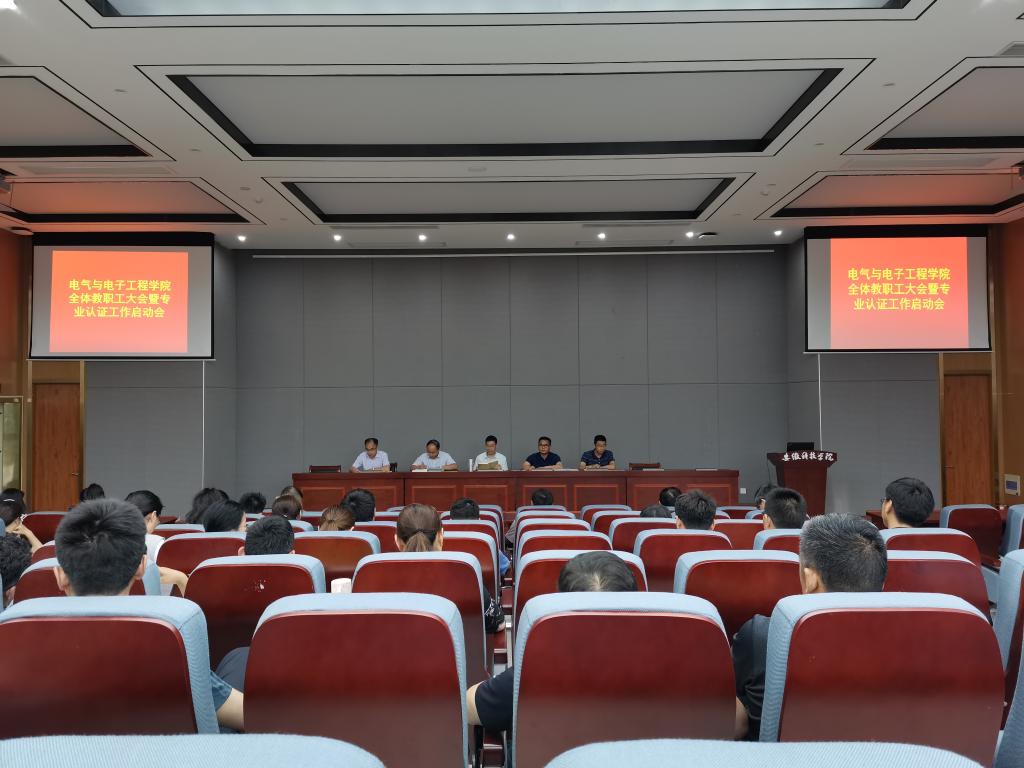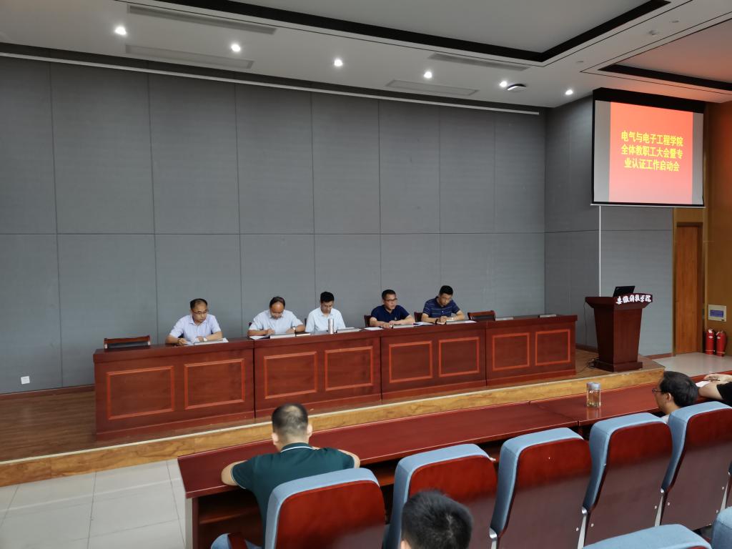 为加强学院学科专业建设,提高专业认证背景下的人才培养质量,6月18日下午,电气与电子工程学院于敏行楼B一楼报告厅召开全体教职工大会暨专业认证工作启动会,对专业认证及期末重要工作进行了部署。院党委书记骆海邦,党委副书记、副院长(主持工作)夏显明,党委副书记尚磊,副院长国海及学院全体教职工参加了会议,会议由夏显明主持。