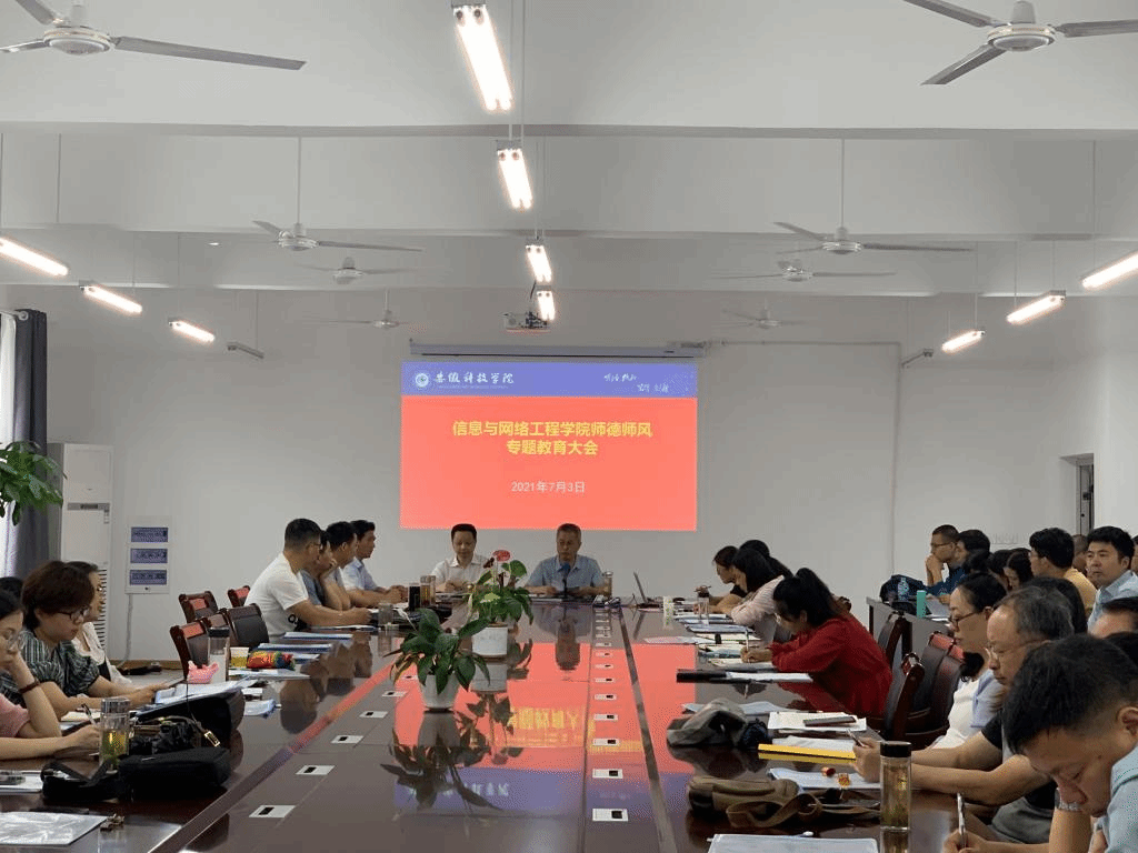 为全面贯彻习近平总书记关于教育的重要论述和全国全省教育大会精神,进一步加强学院师德师风建设,7月3日上午,信息与网络工程学院在尚行楼B418会议室召开师德师风专题教育大会。学院党委书记王振其、院长余宏杰、正处级组织员周向群、党委副书记韦乃学、副院长何恩节、副院长曹浩及全体教职工参加会议,会议由王振其主持。