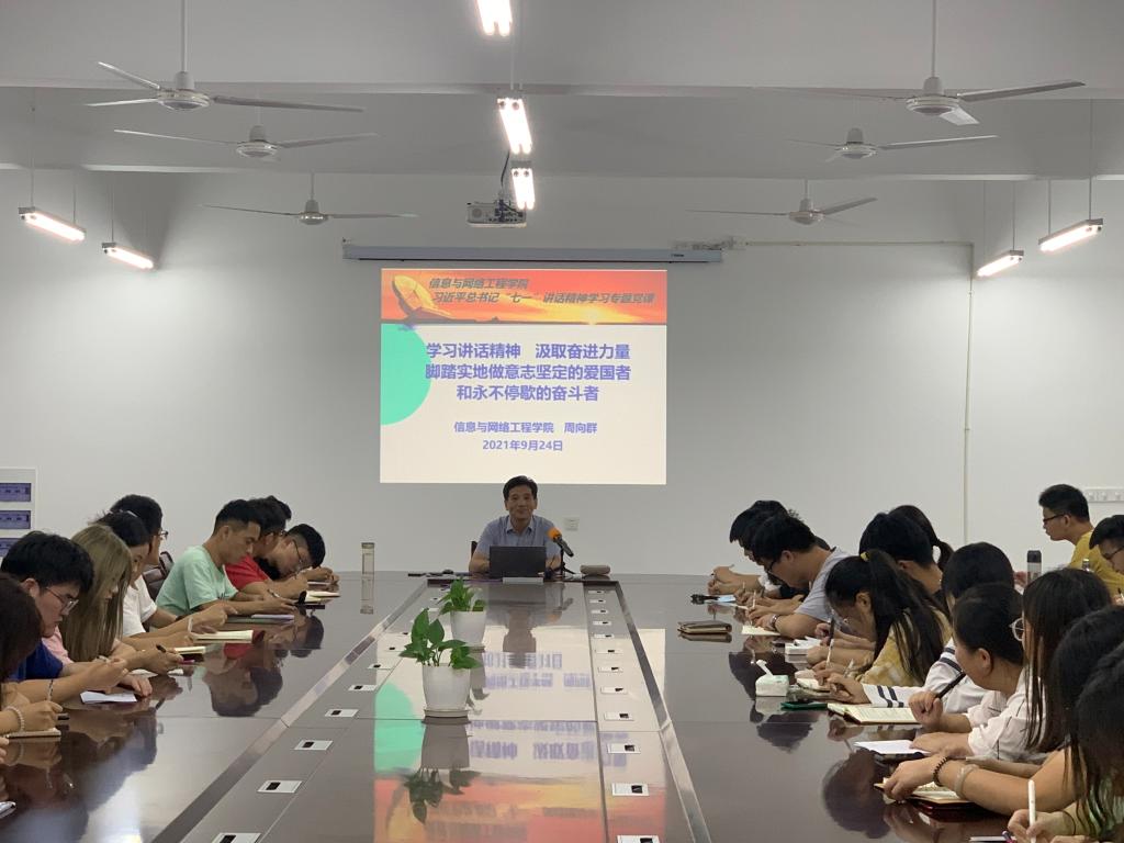 为推进党史学习教育,深入学习习近平总书记“七一”重要讲话精神,9月24日晚,信息与网络工程学院正处级组织员周向群在尚行楼B418会议室为学院全体学生党员作习近平总书记“七一”重要讲话精神学习专题党课。