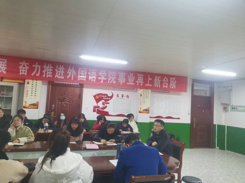 12月6日晚上,外国语学院于院会议室举行参加校第三十届运动会获奖运动员表彰大会暨全体学生干部大会,学院党委副书记张海亮、党政办主任陈慧中、团委副书记宋兵兵、专职辅导员张薇薇出席大会,学院全体学生干部和参加校运动会获奖运动员参会;会议分两个阶段,第一阶段由宋兵兵主持,第二阶段由张海亮主持。