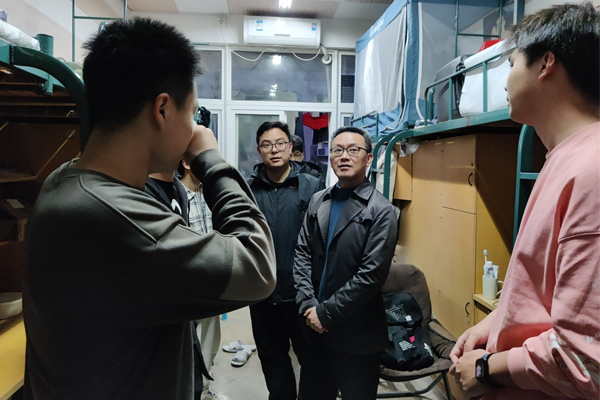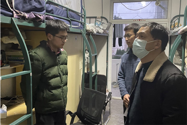 检查走访中,领导和老师们还与同学们亲切交谈,从学习、生活及疫情防控等方面了解学生生活状况和思想动态,并希望同学们能够严格执行学校当前疫情防控管理规定,静心学习,认真做好大学期间的学业规划,为美好的大学生活和未来生活奠定基础;叮嘱同学们要保持积极向上的学习态度与作风,远离网络游戏,积极参与各项实践活动,不断提高自身综合能力与素养;张程在检查走访中详细了解了2019级学生的整体考研情况,并就目标院校、考研复习计划等情况和部分学生进行了深入而愉快的交流,并勉励学生们要增强信心、合理定位,脚踏实地,向着心中的目标院校奋力拼搏!