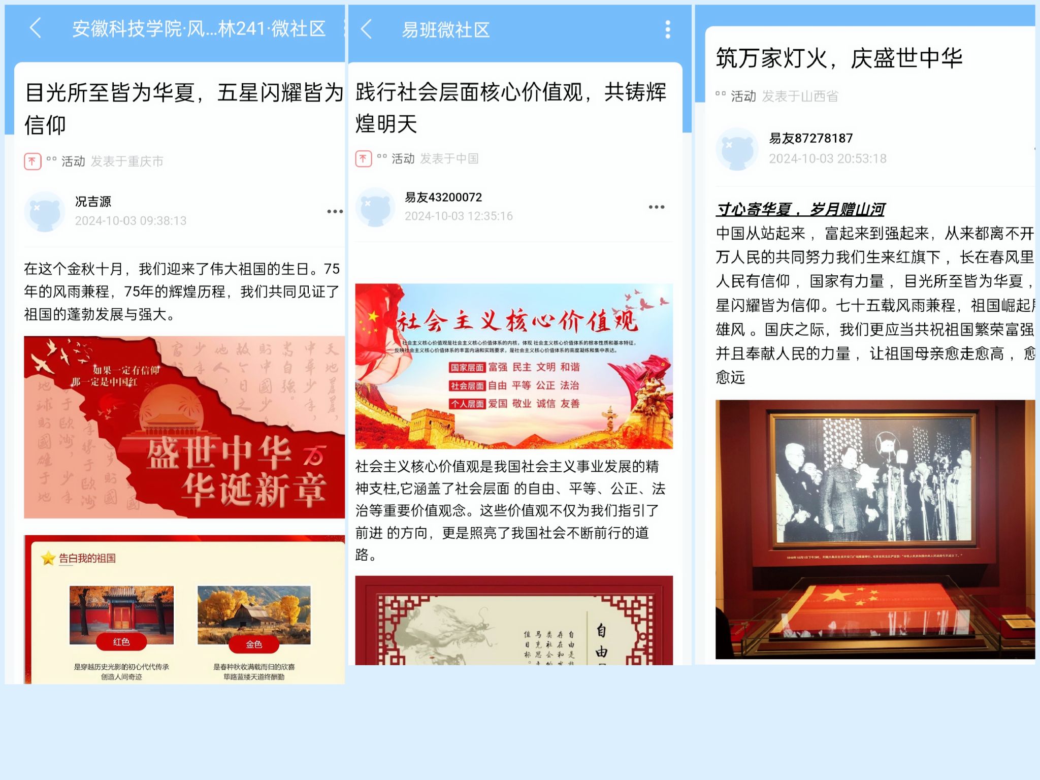 风景园林241班级团支部聚焦国家层面,深刻剖析了社会主义核心价值观对于国家发展的重大意义,不仅加深了学生对这些概念的理解,更激发了他们作为国家未来建设者的责任感和使命感。风景园林242班级团支部则将目光转向社会层面,生动讲述了人民权利与社会公正的力量,让学生在思考中感受到社会进步的脉搏。风景园林243班级团支部则以个人层面为切入点,通过回顾新中国成立七十五年的辉煌成就,强调了爱国、敬业、诚信、友善等个人品质的重要性,有效提升了学生的社会责任感和文化自信。随着学习帖的发布,班级学生积极参与讨论,发表自己的学习心得和感悟,形成了良好的学习氛围。
