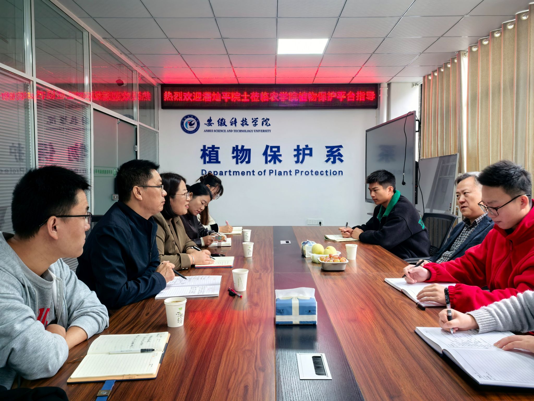 上午,潘院士首先参观了农学院科研温室和植物保护平台,并与平台师生进行深入交流和现场指导,其间,潘院士对植物保护学科教师取得的工作成绩给予了肯定,并为我校植物保护学科的发展出谋划策,从多学科储备、产业结合、项目申报等方面提出很多建设性意见。