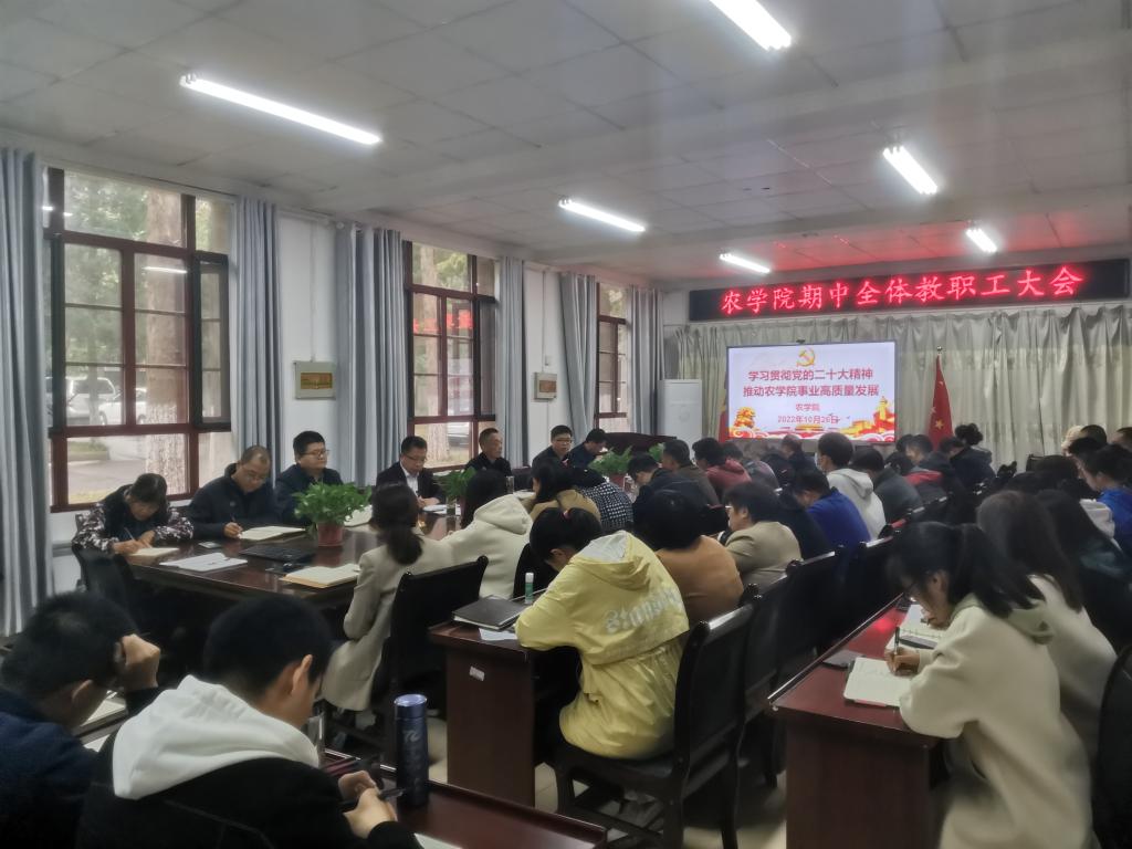 10月26日下午,结合学院近期重点工作部署,农学院在学院会议室召开以“学习贯彻党的二十大精神,推动农学院事业高质量发展”为主题的期中全体教职工会议,集中学习宣讲党的二十大精神。全体教职工参加会议,农学院党委副书记、院长崔广荣主持会议。