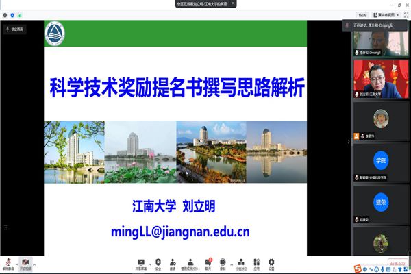 4月16日上午,我校2000届杰出校友、江南大学博士生导师刘立明教授应邀作题为“科学技术奖励提名书撰写思路解析”的线上学术报告。报告由校党委委员、副校长李升和主持,相关学院自然科学学科领域的博士、教授等约160人聆听了报告。