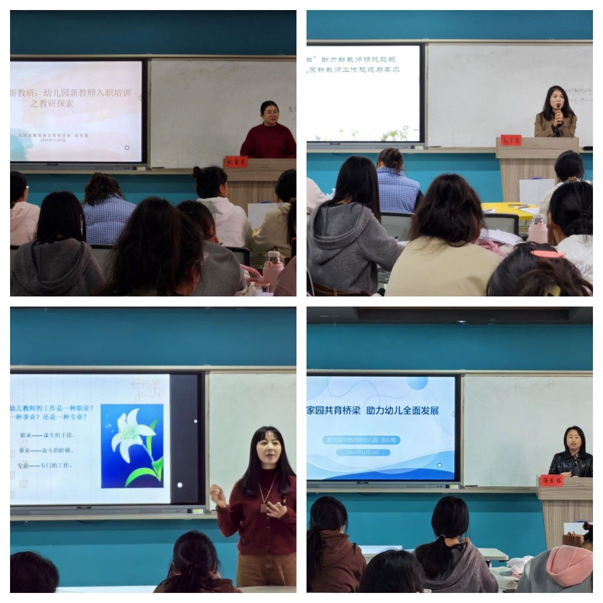 凤阳县云霁街幼儿园园长秦雪艳开展了题为“‘六部曲’助力新教师扬帆起航——幼儿园新教师工作规范”的专题讲座,围绕新教师的岗位职责、日常工作流程、行为规范、职业修养及安全须知以及搭建家园沟通桥梁。凤阳县中都西苑幼儿园园长汤乐梅,强调搭建家园共育桥梁的重要性,助力幼儿全面发展。凤阳县示范幼儿园园长金洁开展了题为“新手上路,从‘心’开始”的专题讲座,论述如何做合格的幼儿教师。本次培训对落实立德树人根本任务,提高新进教师的职业道德修养、教育教学水平和科学研究能力起到了良好的促进作用。此次活动还专门邀请了评审专家,为凤阳县2023年入职的123位教师进行了业务能力考核。