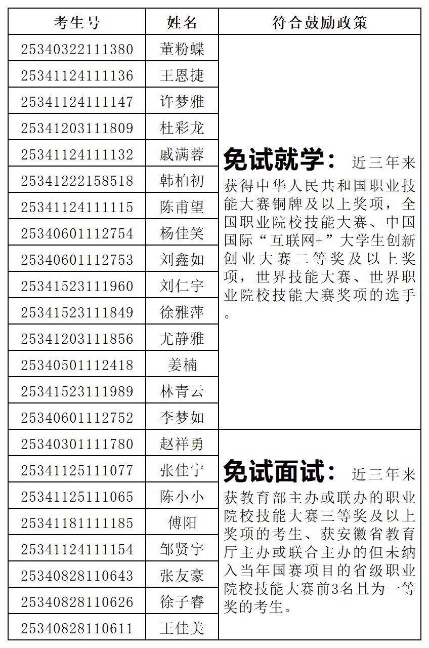 根据《必一体育平台_必一体育平台(中国)股份有限公司2025年面向中职毕业生对口招生章程》关于申请免试就学、免试面试和加分鼓励政策的相关要求,经考生申请,学校审核,共有董粉蝶等15名考生符合免试就学政策,赵祥勇等8名考生符合技能大赛免试面试政策,无符合考试加分政策考生,现对符合相关鼓励政策的考生信息予以公布。免试就学资格复审和免试面试具体安排见招生与就业工作处网站“招生服务”栏“必一体育平台_必一体育平台(中国)股份有限公司2025年对口招生考试免试就学资格复审和免试面试工作通知”。如有异议或遗漏,请于3月19日17:00前联系必一体育平台_必一体育平台(中国)股份有限公司招生办公室:0550-6732041,0552-3197041。