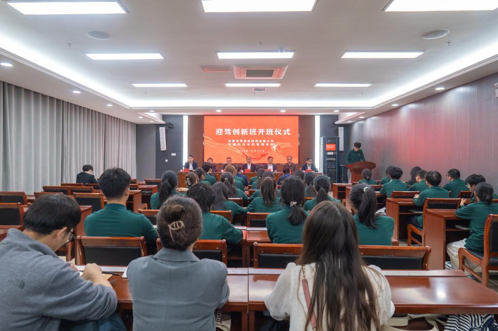 金秋送爽,硕果飘香。10月27日下午,由管理学院与迎驾酒业销售有限公司联合举办的“迎驾创新班”开班仪式在我校龙湖校区西辅楼111会议室如期举行。校党委委员、副院长王孝义,教务处副处长、创新创业学院副院长高青海,安徽迎驾酒业销售公司副总经理兼安徽管理中心总经理周鹏,安徽迎驾贡酒股份有限公司人力部部长李晓洵,安徽迎驾酒业销售有限公司人力部部长吴兵兵,蚌埠区域总经理何权及管理学院党政领导出席了开班仪式。开班式由管理学院党委书记丁景良主持。