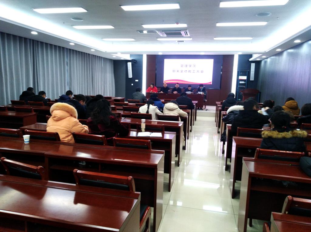 1月20日下午,管理学院在龙湖校区西辅楼111会议室召开期末全体教职工大会,布置期末及寒假重点工作。学院党政领导及全体教职工参加会议,会议由党委书记丁景良主持。