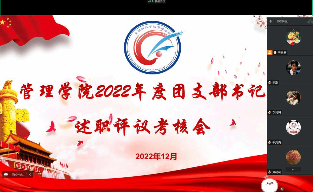 为进一步加强学院团支部建设,不断提升基层团支部引领力、组织力和服务力,12月25日晚,管理学院团委召开2022年度“对标定级”团支部述职评议线上会议。团委副书记江旭聪出席会议,会议由团委组织部部长李欣然主持。