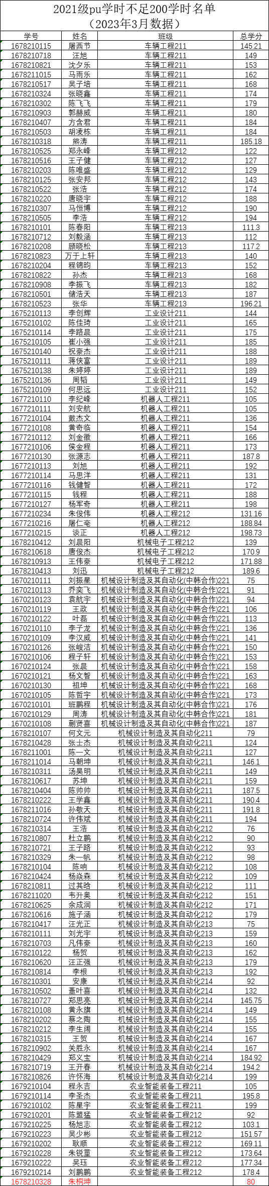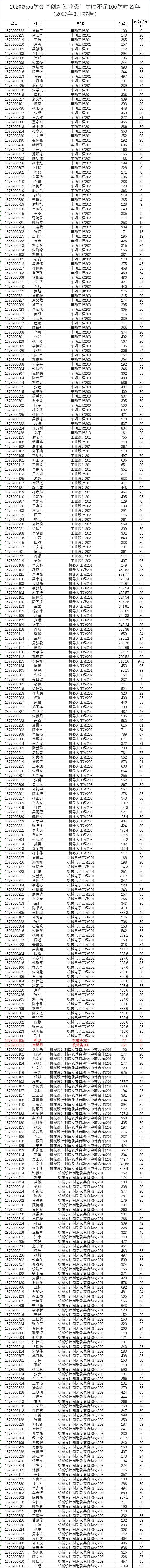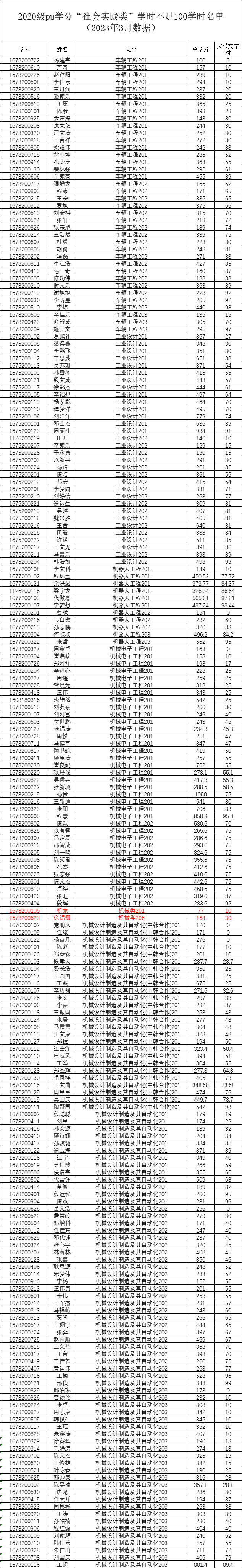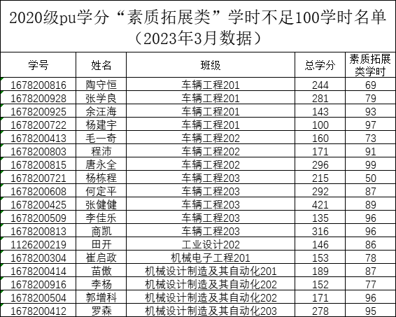机械工程学院2022-2023-2学期二课堂学分(PU)未达标名单公示(2020级、2021级、2022级)