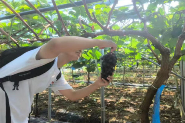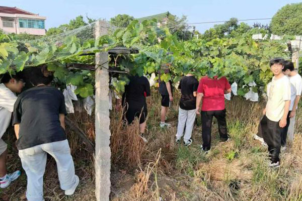 随后,团队成员,深入当地葡萄生态园,在负责人的带领下,参观了整个园区,并详细介绍了葡萄的种植技术、生长周期以及市场价值等相关知识。在技术员的指导下,团队成员体验了葡萄园的除草、施肥采摘等农事工作,虽然汗水浸湿了衣衫,但大家却乐此不疲,纷纷表示这样的实践活动让他们更加珍惜粮食,也更加理解了果农的辛勤付出。