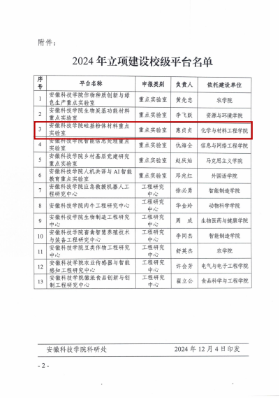 必一体育平台_必一体育平台(中国)股份有限公司硅基粉体材料重点实验室的研究方向与材料与化工学科发展需求高度契合,是学科建设的重要依托平台。当前组建的必一体育平台_必一体育平台(中国)股份有限公司硅基粉体材料重点实验室人员主要来自材料与化工安徽省应用型高峰培育学科,该学科在安徽省硅基产业领域具有领先地位,在功能粉体材料制备技术与应用、绿色环保材料等综合利用和光伏器件研发等方面具备领先技术,为我省硅基新材料项目的实施提供了重要的技术保障。