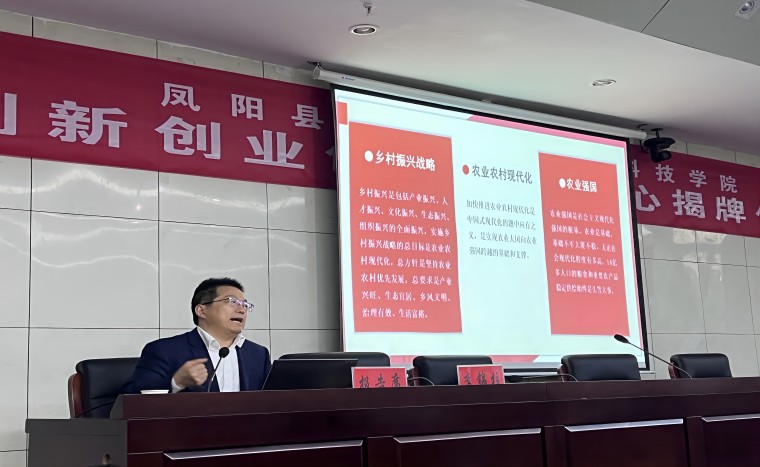 揭牌仪式后,李锦柱为入驻我校创业园的创业团队大学生作题为《中国式现代化背景下的小岗村之路》的专题辅导报告。李书记用通俗生动的语言为同学们展现了在中国式现代化背景及党和国家的关怀下小岗村的农村改革发展之路,指出小岗村作为改革开放主要发源地之一,要勇担责任、积极作为,发扬小岗精神,扛起新时代改革发展的大旗,为我国农村改革和乡村发展贡献自己的力量。
