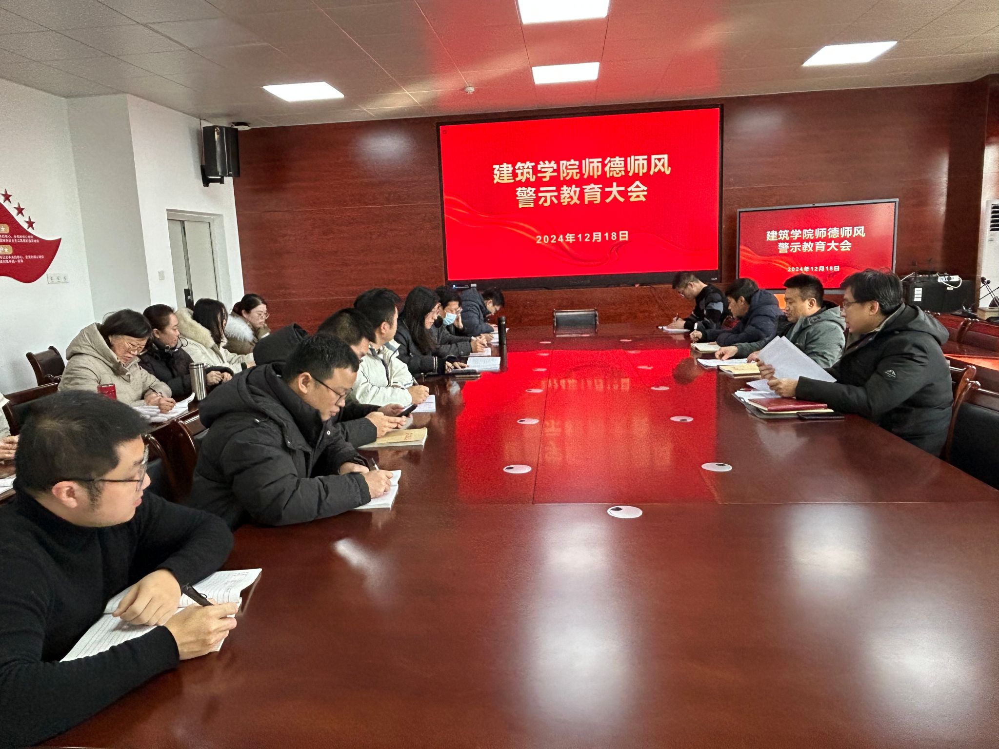 为深入学习贯彻党的二十届三中全会精神,落实《中共中央国务院关于弘扬教育家精神加强新时代高素质专业化教师队伍建设的意见》,全面推进师德师风建设,规范教师履职尽责行为,发挥师德失范问题典型案例警示作用,引导广大教师知准则、守底线,自觉涵养高尚师德,弘扬践行教育家精神,根据《关于集中开展师德师风警示教育活动的通知》(人事〔2024〕64号)精神,结合近期各高校发生的教师违法违纪违反教师职业道德规范等事件,建筑学院于12月18日下午在尚行楼A301开展以“强化师德师风,践行立德树人”为主题的师德师风警示教育,学院各教研室主任、实验室主任、博士、副教授参加会议,会议由学院副院长吴伟东主持。